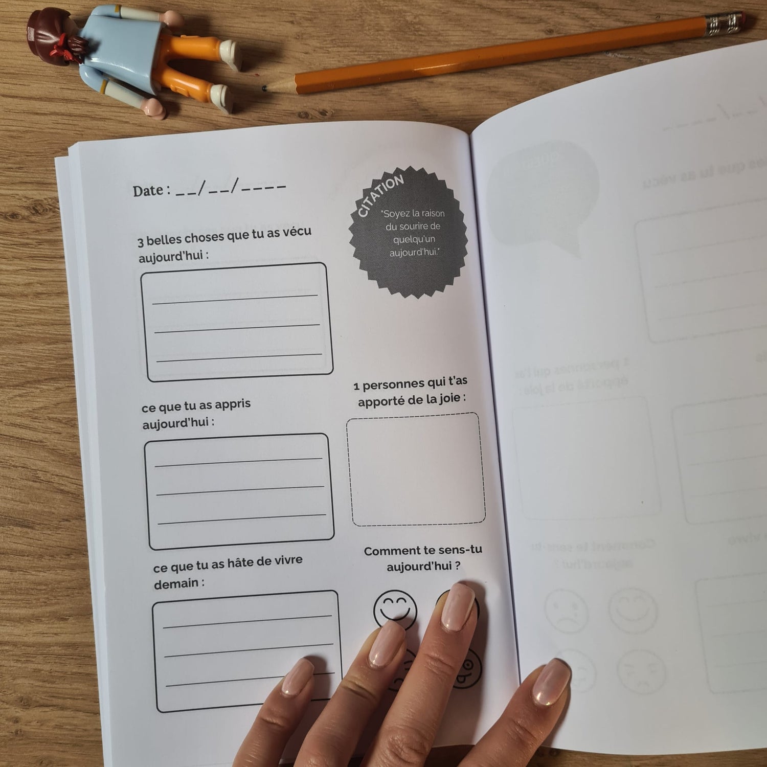 Un Carnet de Gratitude est un journal conçu pour aider les enfants à cultiver une attitude de gratitude en notant quotidiennement les moments de bonheur, de reconnaissance et de positivité dans leur vie. Chaque jour, l'enfant prend quelques instants pour réfléchir à ce qu'il apprécie et le note dans son carnet.